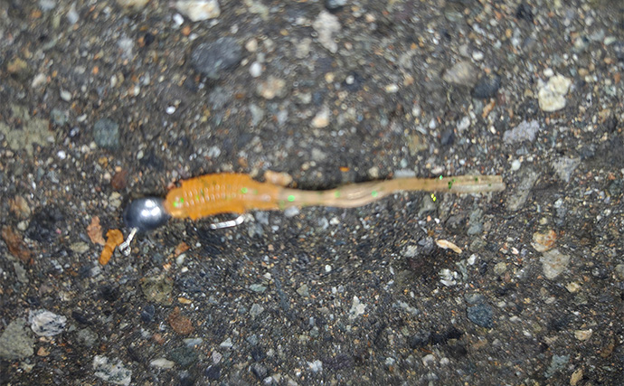まずは0.4gからスタートしたが、反応が無いしタナが合ってない印象。実釣時間が限られていたため、3投で見切りをつけてジグヘッドを0.8gに変更。レンジをボトム寄りに取り、底を意識した釣りに切り替えると、アジの小さなアタリが出始めた。