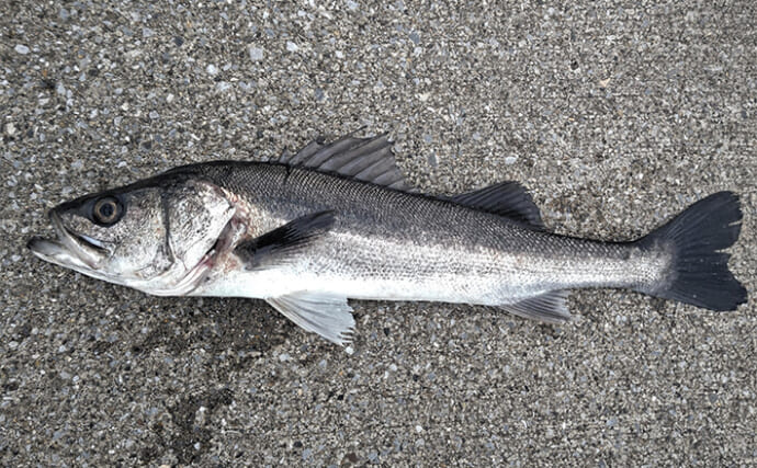 慌てて竿を握りしめ、頃合いを見て大きくアワせる。すると、竿は大きく竿が曲がり、重量感ある大型魚がヒット。強い引きに耐えていると、突然ジャンプしてエラ洗いする大型スズキが姿を現した。