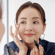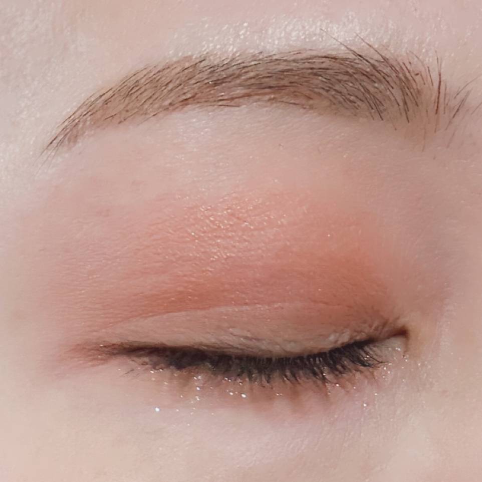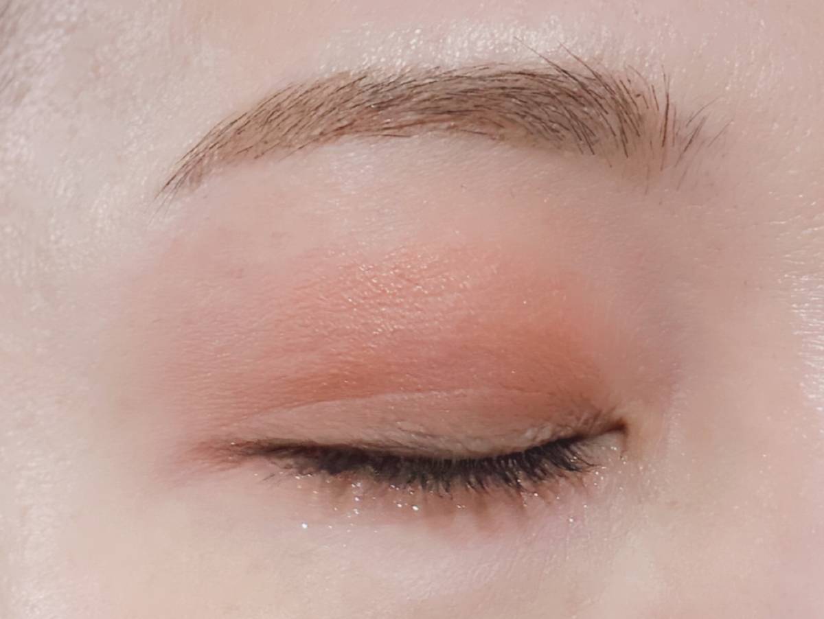 1. B:くすみピンクを上まぶたのキワから眉の下辺りまでと下まぶたの涙袋辺りに塗布