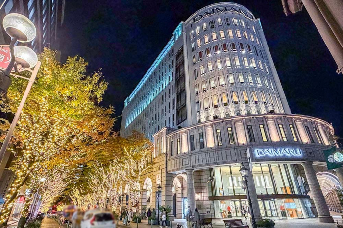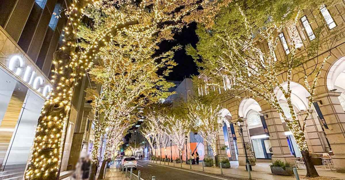 『大丸神戸店』の東側に続く街路樹には繊細な光がまとい、見慣れたストリートが一気に華やいでいます。夜でもほのかに明るく、歩くだけでロマンティックな世界へと引き込まれるよう。