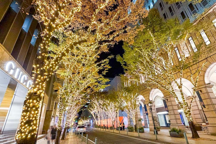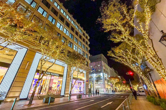 明石町筋周辺は、ハイブランドが軒を連ねる華やかなエリアで、イルミネーションがディスプレイともマッチしていて美しい。浜手幹線方面まで光が続き、そのなかを家族連れやカップルが楽しそうに散歩する姿も見られました。
