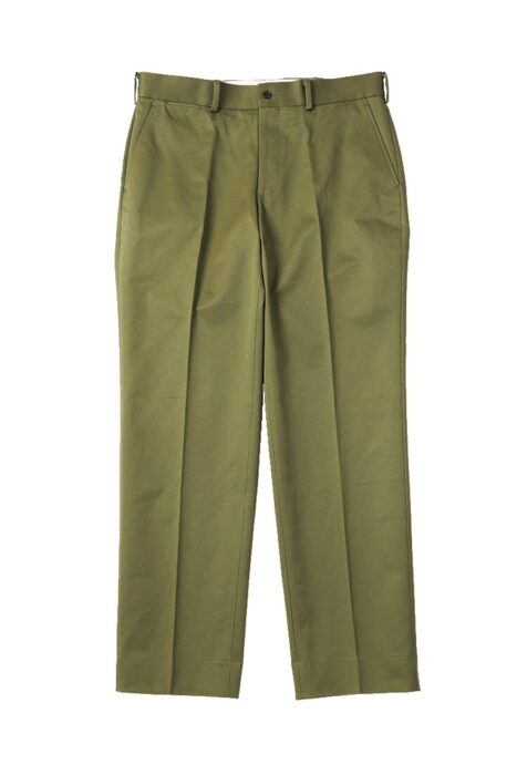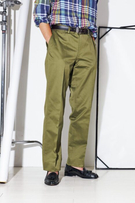 昨年30周年を迎えた恵比寿の名店「Pt.アルフレッド」の名物店主・本江さんに選んでもらったオリーブのノータック。高密度に織り込まれた嵩高なチノクロスを採用しており、一般的なチノパンの生地が9オンスなのに対して、こちらは11オンス! ガシガシ穿き込んで自分だけの1本に育てたい。1万9800円(Pt.アルフレッドTEL03-3477-7952)