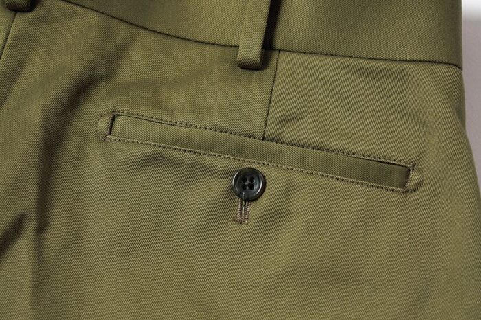 バックポケットは片玉縁仕様。[45カーキ]などにみられる意匠だ。ポケット口には補強のためのD管止めが施されている。