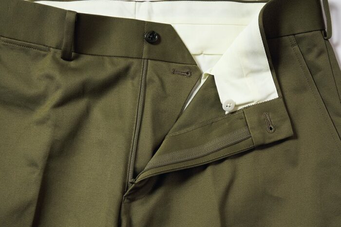 フロントはジッパーフライ仕様。ウエスト内側には、ドレストラウザーズなどに多くみられるディテールである、持ち出しが付く。