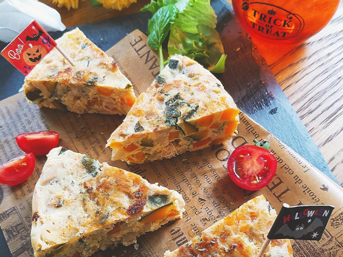「かぼちゃに、美肌やダイエットに役立つ栄養がたっぷりの酒粕をプラスして仕上げた、イタリア料理のオムレツ『フリッタータ』。彩りがよく栄養満点なので、ハロウィンだけでなく、ふだんの食卓やお弁当のおかずにもぴったり。素材の味を活かした味つけなので、ソースは不要です」