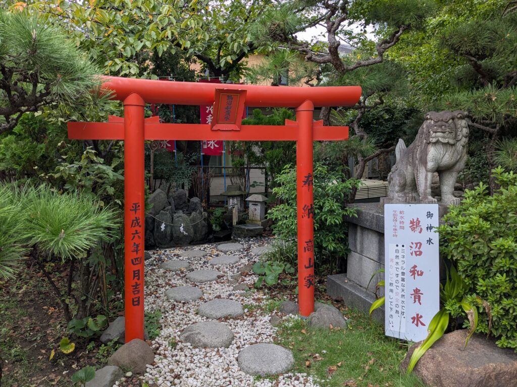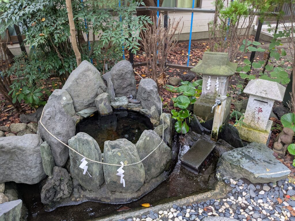 入り口の大鳥居をくぐり、少し歩くと見えてくるのは、ミネラルたっぷりの御神水として飲用されている湧き水「鵠沼和貴水」。