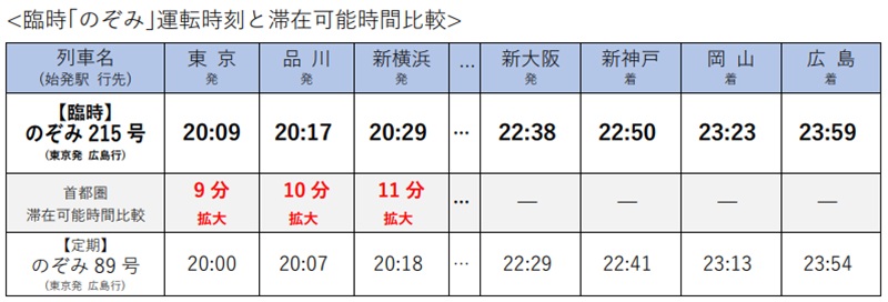 これは20:09東京駅発の新大阪行き定期列車を利用の多い日に臨時列車として広島駅まで延長運転するというもの。広島駅行きの最終定期列車20:00東京駅発「のぞみ89号」の後に設定され、20:09に東京駅を出発、23:59に広島駅へ到着します。これにより、広島駅まで利用する場合の首都圏での滞在可能時間が最大11分拡大。より長く滞在できるようになります。