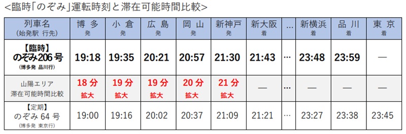 従来の東京駅行き最終定期列車は19:00博多駅発の「のぞみ64号」ですが、「のぞみ206号」は19:18に博多駅を出発、23:59に品川駅へ到着します。これにより、新横浜駅や品川駅まで利用する場合、山陽エリアや名古屋での滞在可能時間が最大21分拡大することになります。