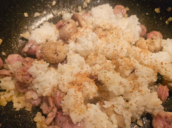 そこに勝栗ごはんを投入したら、コンソメ顆粒で軽く味付けして完成だ。