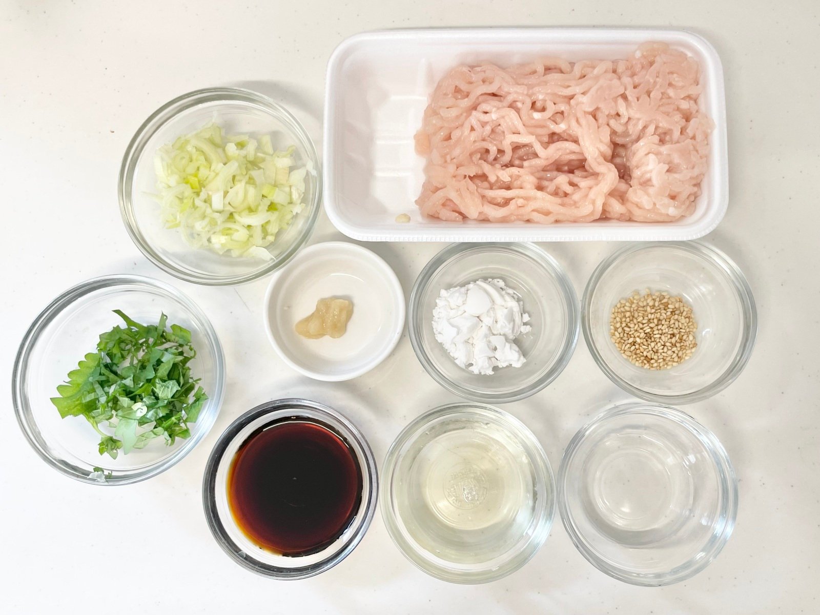1.ボウルに鶏ひき肉、ねぎ、大葉、しょうが、A を加えて混ぜ合わせます。