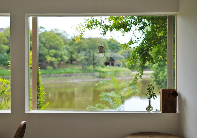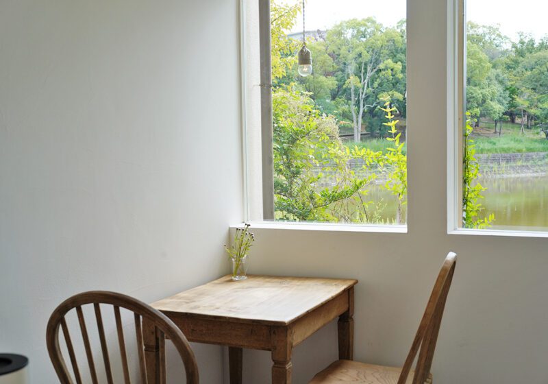 店内に入ると、大きな窓の先に広がる風景に目を奪われます。「物置として使われていた場所だったのですが、扉の先に見えた『鹿助(ろくすけ)公園』の池の景色を気に入り、カフェとして活用することにしました」と田中さん。このロケーションを活かすために、窓を大きく取り、内装は極力シンプルに仕上げられています。