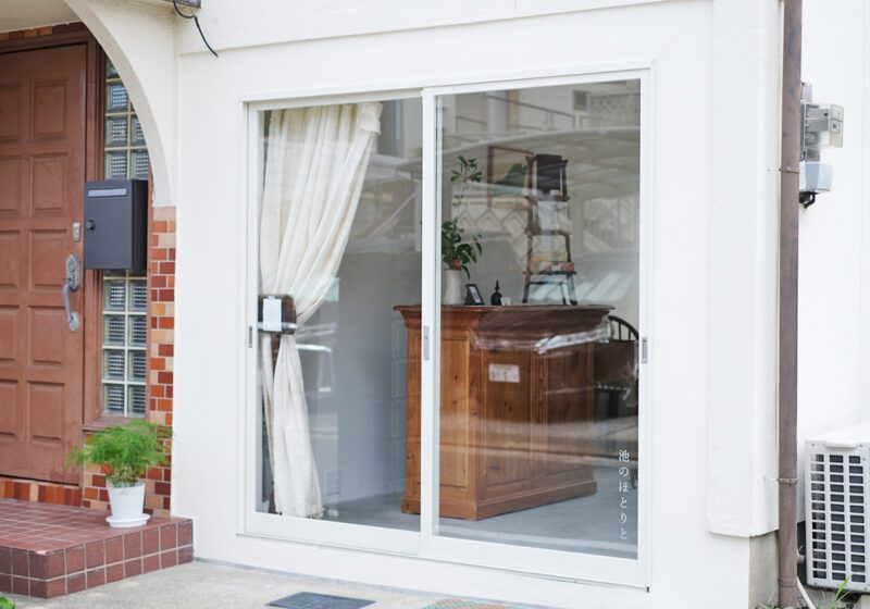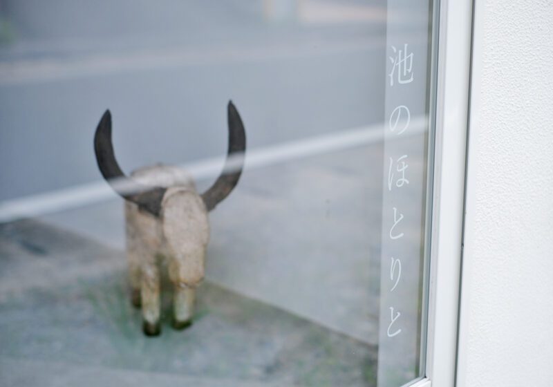 住宅街の一角にひっそりと佇むカフェ「池のほとりと」。カーテンが閉まっていたらカフェと気づかずに通り過ぎてしまいそうなさりげない外観です。窓に記された店名とかわいい木彫りのオブジェを目印にして訪れてください。