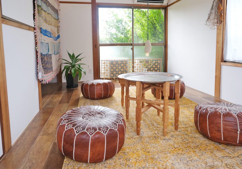 靴を脱いで上がる2階席はよりリラックスして過ごせそう。モロッコのプフクッションやインドのヴィンテージキルトが配され、異国的なムードが漂います。