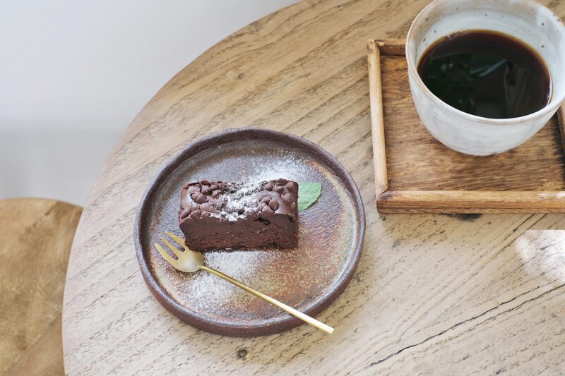 バレンタインなどに「RAKUYA」で提供されているものを定番化した小麦粉不使用の「ガトーショコラ」(600円)は、生チョコのように濃厚な味わい。深煎りの豆で淹れる「ホット珈琲」(550円)と好相性です。