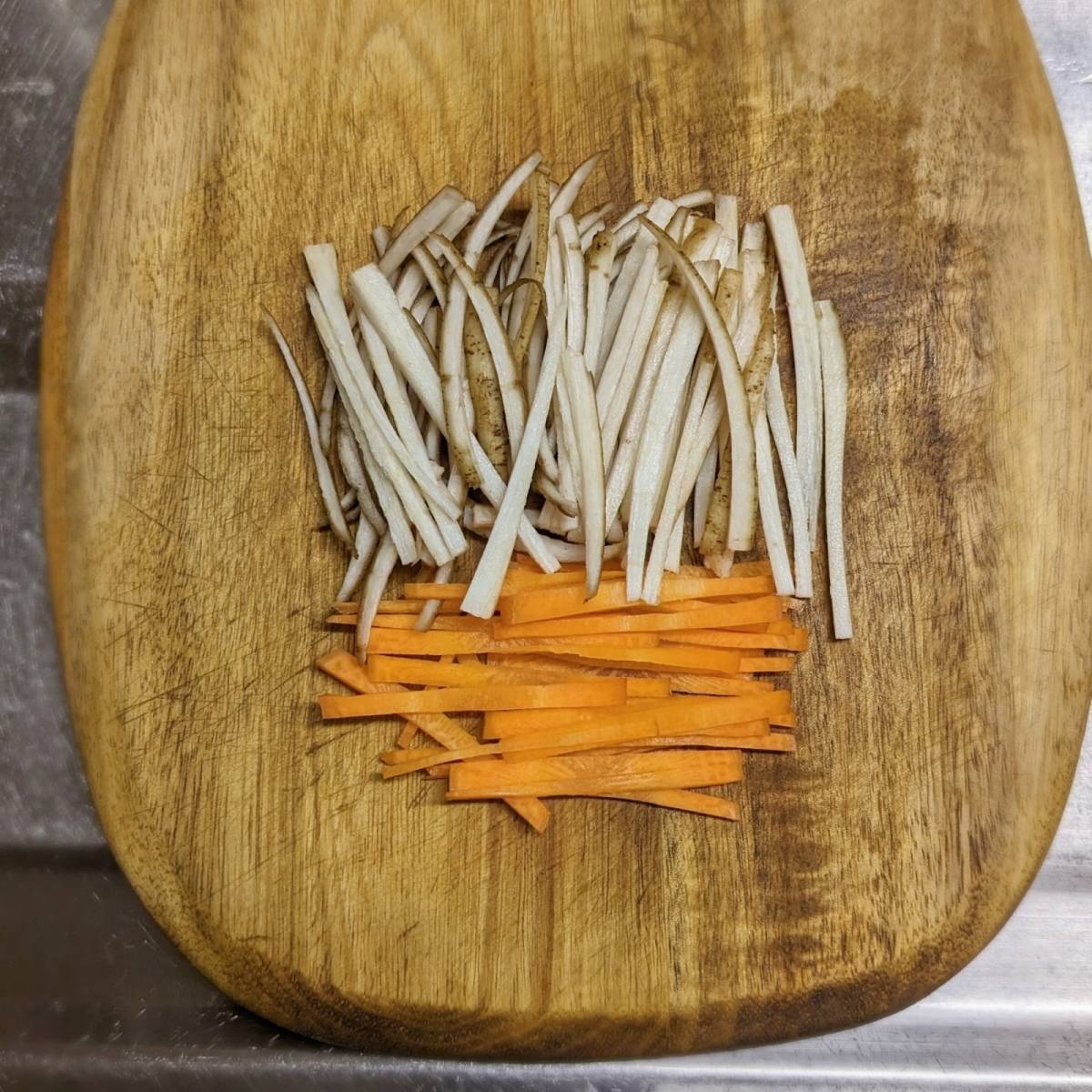 ごぼうとにんじんは、皮付きのまま千切りにします。