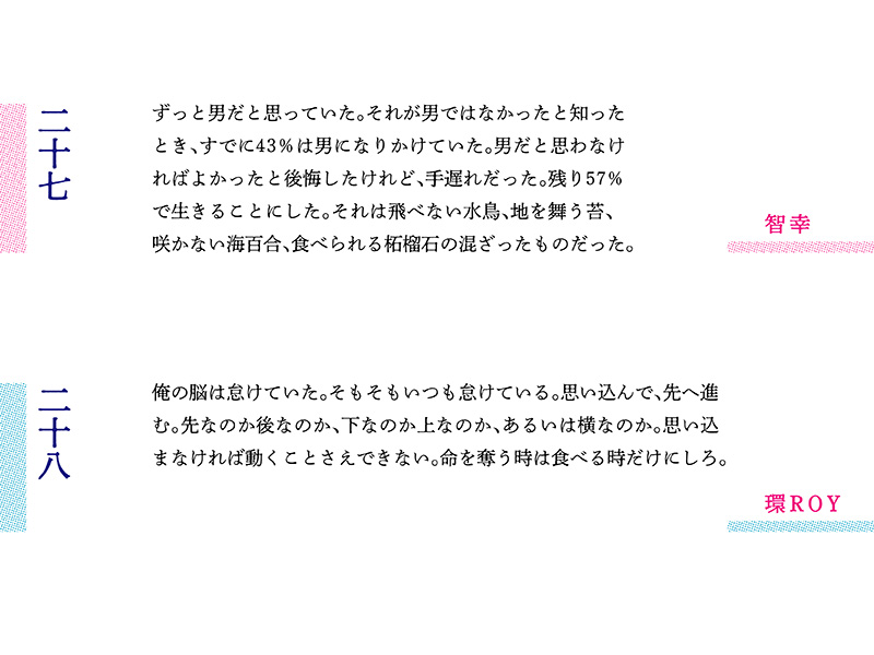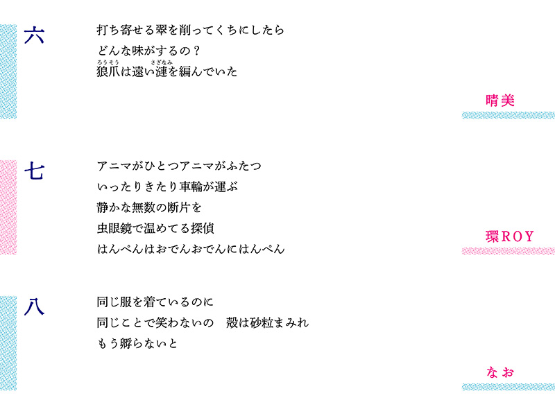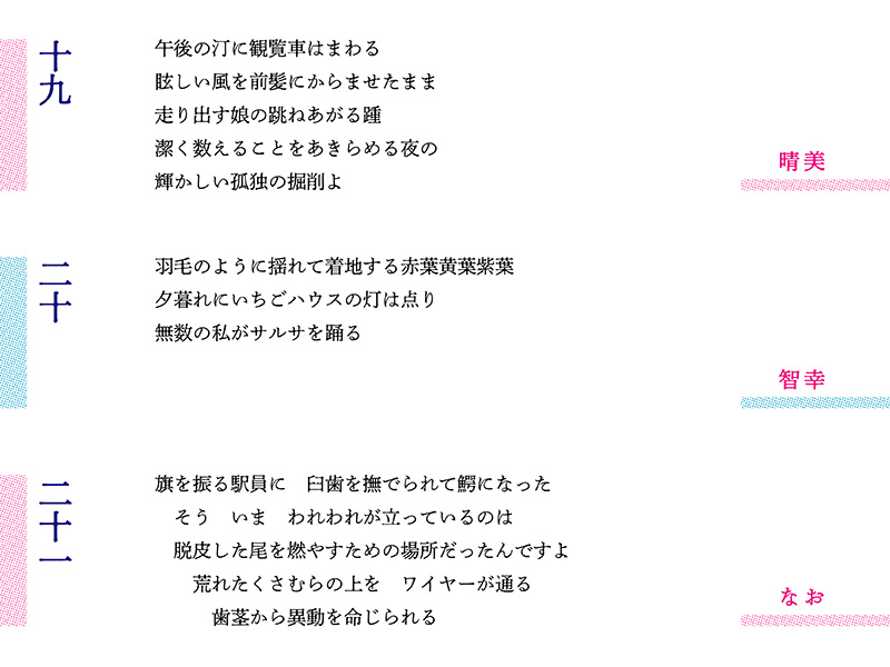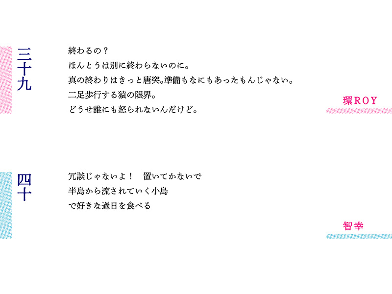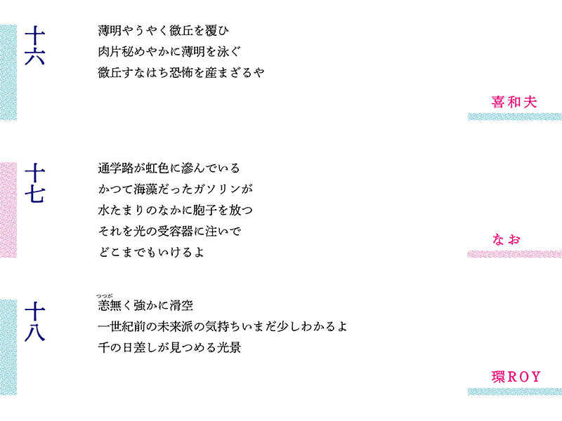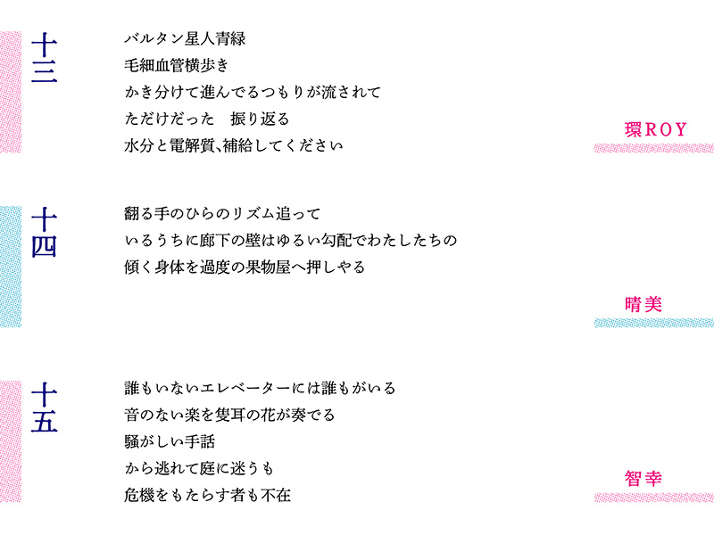 ラップ的な抑揚と現代詩的な改行を駆使した環さんの第13編に続き、川口さんは「翻る手のひらのリズム」と環さんのラッパーしぐさを三行詩に取り込んだ。ジャンルの境目を侵食する試みがいよいよ顕著になってきた。
