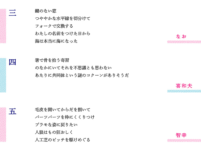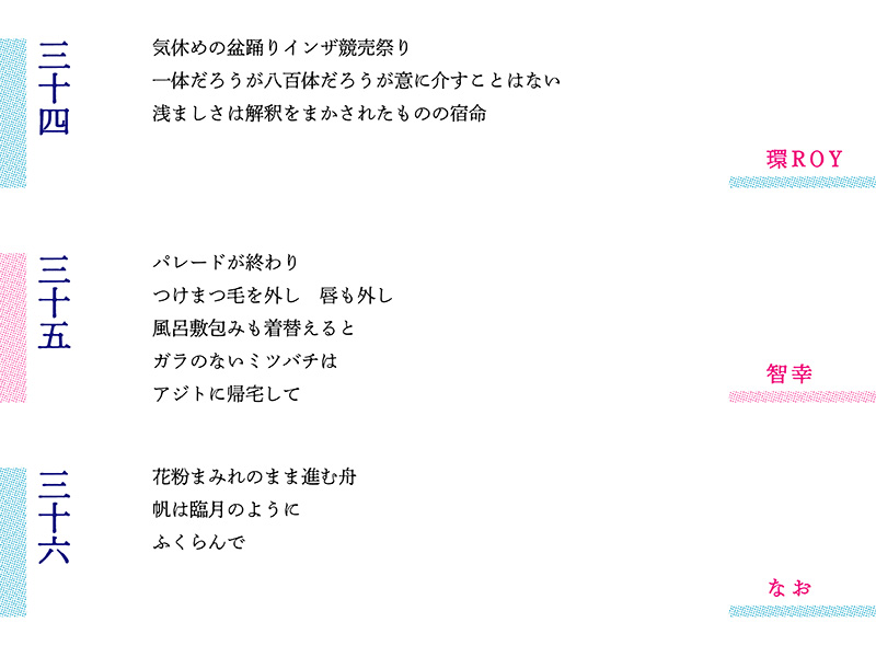 最終盤、参加者はおのおの別れの言葉をしたためる。水沢さんは第36編で、自作に通底する「生む/生まれる」を強烈に感じさせる「臨月の帆」を膨らませ、続く川口さんは脚韻を使って「次の世界」を見通した。