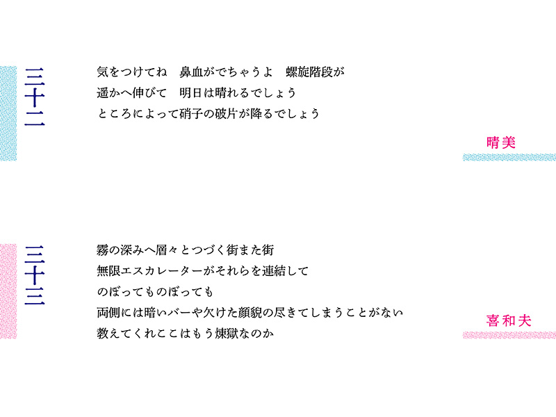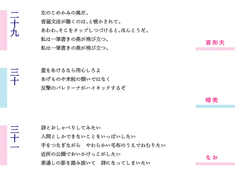 第27~29編に男性性の強まりを敏感に感じ取った川口さんは第30詩でオルゴール、あるいは人間の頭蓋骨をパカッと開け、回転するバレリーナを飛び出させた。「閉じ込められていたんだからハイキックで攻撃」。アグレッシブに詩的世界を展開した。