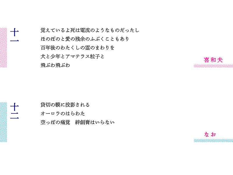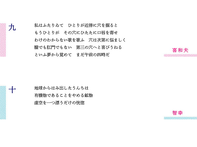 第8編で二つの卵を提示した水沢さんを受け、野村さんは「穴」を列記して「第3の性愛」を思い描いた。五行詩に1から4までの数字を散らし、連詩の「遊び」的要素も導入した。肛門から出る排泄物を宇宙に放つことで「息の根を止め」、野村さんのエロスを封じるというたくらみを凝らしたのが第10編の星野さん。百戦錬磨の野村さんはこれを受けて宇宙空間に「愛の残余」をふぶかせ、「アマテラス粒子」という高エネルギーの宇宙線で空間を突き破った。