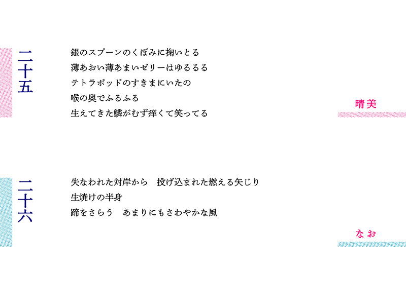 第24編で野村さんのつくった「塊」はやわらかくもあり、硬くもあり。読み手を幻惑する。第25編の川口さんは、徹頭徹尾やわらかくしたようだ。ゼリー状のそれを「銀のスプーン」で掬った。
