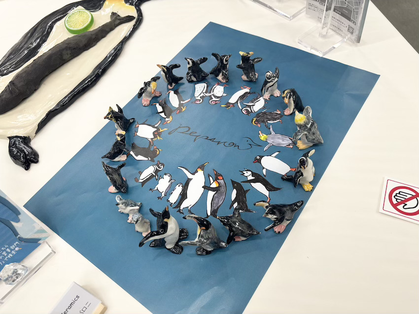 ペンギンのイラストの上を、陶のペンギンたちがちょこちょこお散歩しているようなデザイン!