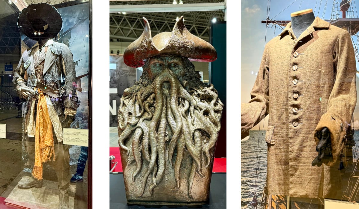 代表作『パイレーツ・オブ・カリビアン』シリーズからは、デップ演じるジャック・スパロウの展示こそなかったものの、『パイレーツ・オブ・カリビアン/ワールド・エンド』(2007)より、デイヴィ・ジョーンズのデジタルアニメーション制作のために製作されたグラスファイバー製の胸像と、ジェフリー・ラッシュ演じるバルボッサのコスチューム、オーランド・ブルーム演じるウィル・ターナーのコートが登場した。