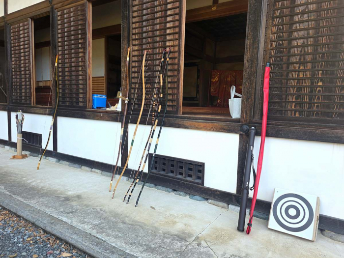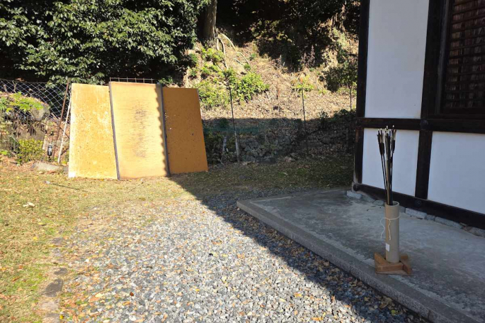 実際に使用するのが、こちらの畳と弓矢。弓と言えば、「弓道」のイメージがありますが、こちらで体験出来るのは“所作”のある弓道ではなく、戦闘で使用する“戦弓(いくさゆみ)”などに近いそうです。