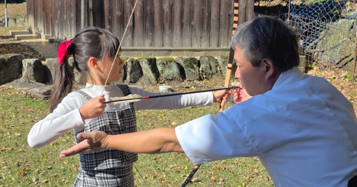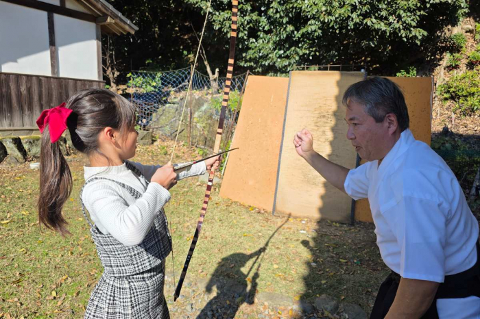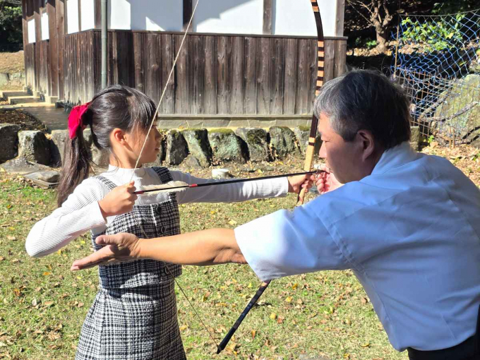 教えて頂いた通りにすると、最後にはまっすぐ綺麗な矢を放つことが出来ました。「引くのは難しいけどとっても面白い!」と大満足な様子。