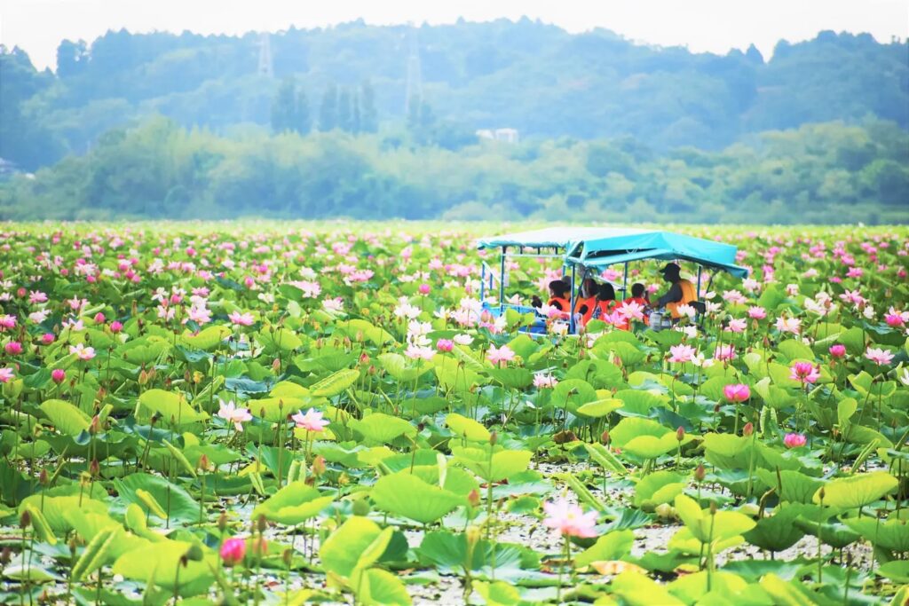 「伊豆沼はす祭り」は見頃時期に合わせて開催され、期間中は遊覧船に乗って、間近でハスを見ることができます。