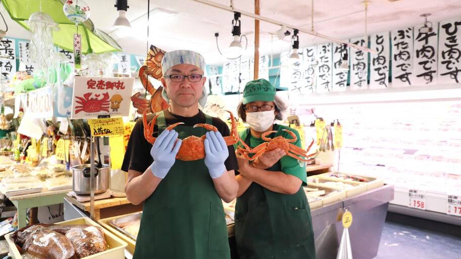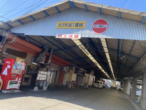 競り場と商店街が一体となった人気スポット、田崎市場のえびす1番街。