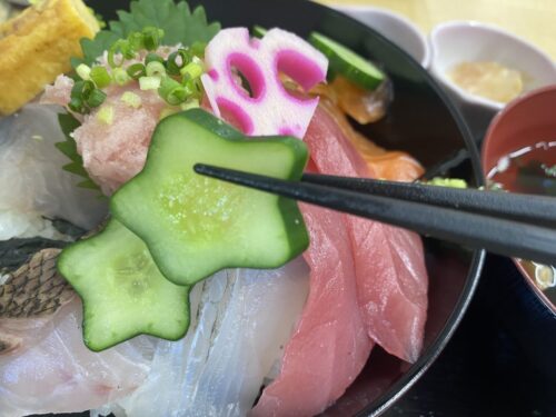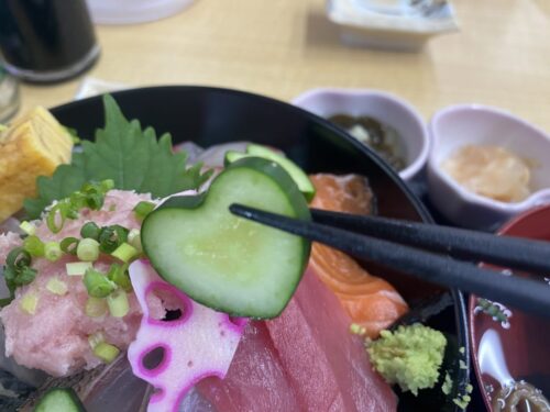 実はこちらのきゅうりは、店外で案内をしていたオーナ夫婦のお父さんが作られました。 星やハートにするためのきゅうりのケースは1個400円もするのに、きゅうりの成長によってはすぐに割れてしまうという清算に合わないものなので娘夫婦の海鮮丼に使用するために作っている特製愛情きゅうりなんです。 そのため大量には作れないので、その日の分を使い切ってしまったら後は普通のきゅうりになります。星やハートのきゅうりがあったら、ラッキー!くらいに思っておいてくださいね。