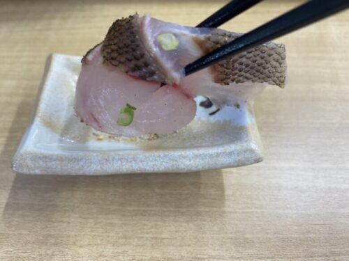 柑橘系の味が付いた塩が、白身のお魚によく合います。 それにしても皮目まで美しい…。ぷりっぷりの歯ごたえです。