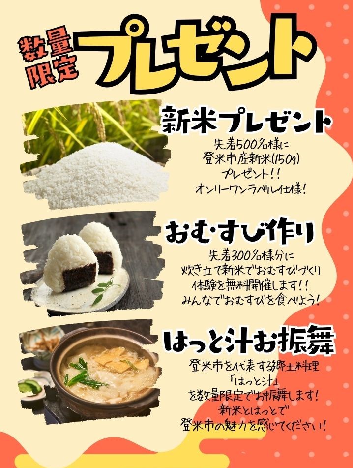 「はっと汁」のお振舞いやおむすびづくり体験は数量限定のため、早めの来訪がおすすめです。