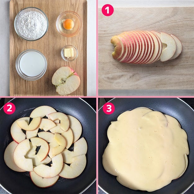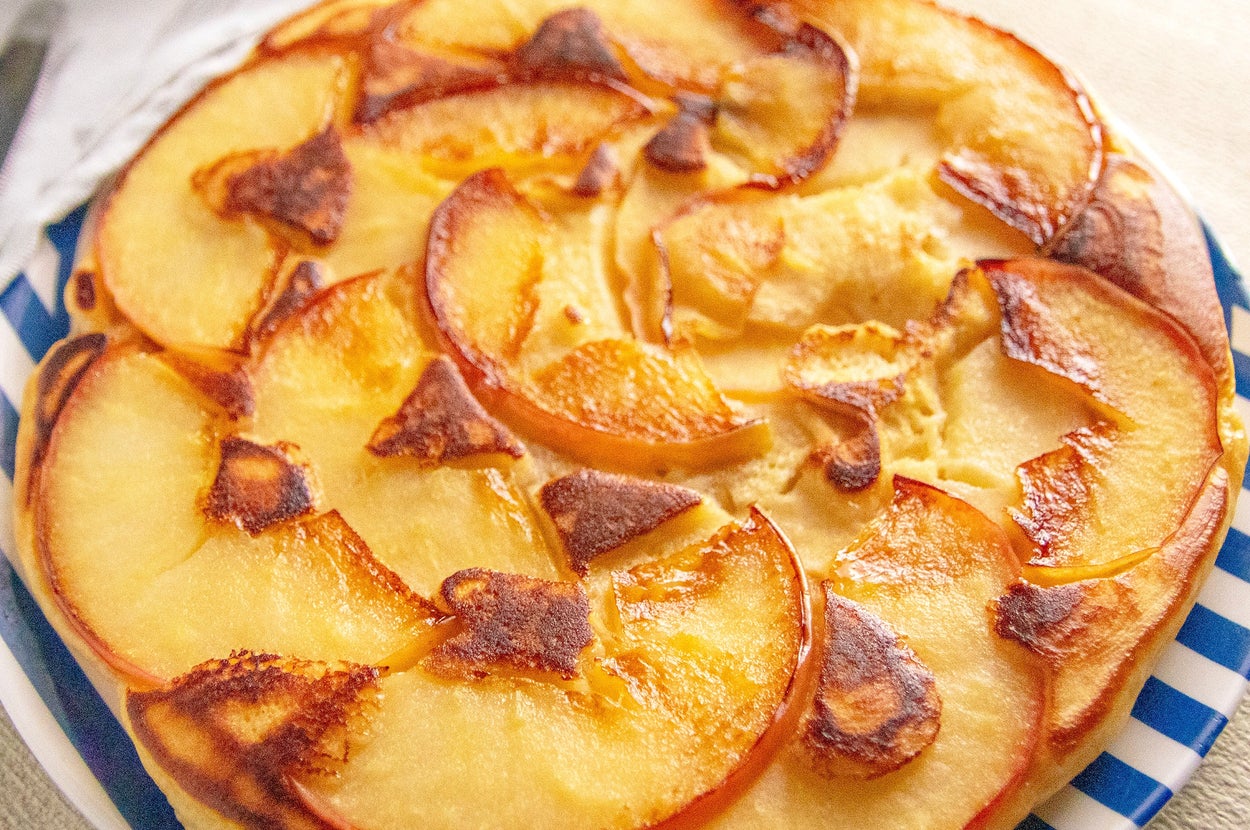 ③【A】を混ぜ合わせた生地を②のりんごの上に流し入れる。ふたをして弱火で3〜4分焼き、表面が乾いたら裏返す。裏面を1〜2分焼き、火が通ったら、完成!