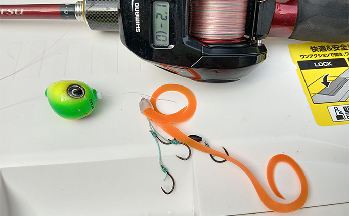 私のタックルは乗せ調子でしなやかな専用ロッドに、同じく専用ベイトリール、ラインはPE0.8号、リーダーは3号3m、シンカーは80g、ネクタイは前回使い回した5種類の中で、気に入っているオレンジ黒シマカーリーに3本バリをセットした。
