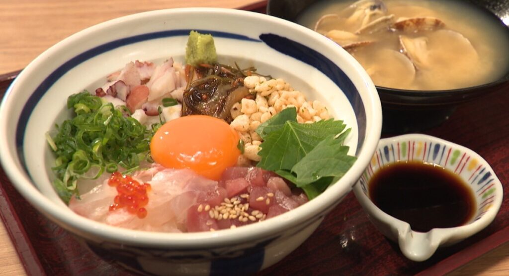 人気の「旨味源ちゃん丼」。マグロや鯛、タコなど色とりどりの海の幸がのっていて、最後に卵黄をのせます。甘めのだし醤油をかけ、黄身を崩して混ぜると、海鮮や松前漬けと絶妙に絡み合い、いろんな味が楽しめます。こうした丼が1000円前後という価格も魅力ですね。