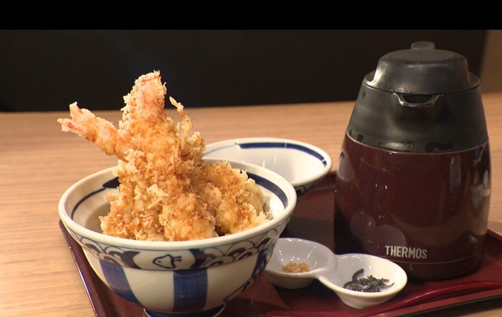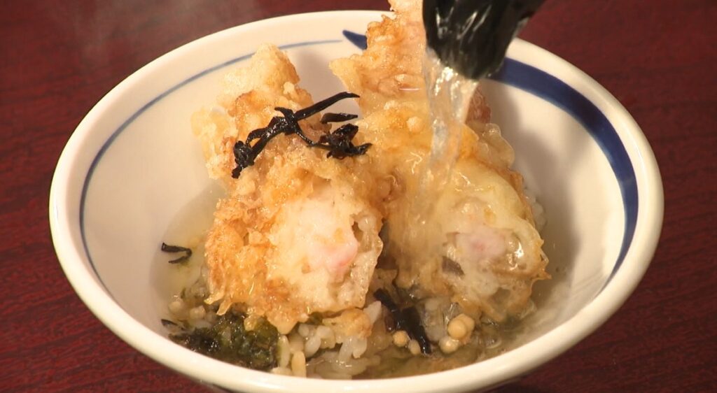 大きな海老天が3本ものった天丼もあります。こちらは鯛のだし汁で「天ぷら茶漬け」にすることもできます。