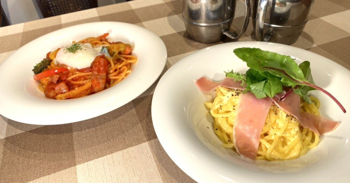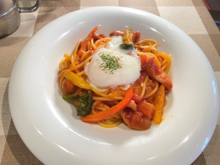 王道のナポリタンは、トマトの旨味が生パスタの味を引き立てる大人の味わい。半熟卵をとろりとまとうと、まろやかな味に変化します。