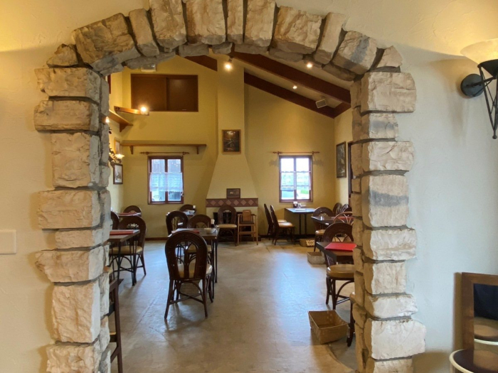 石積みタイルのアーチ形の入り口を入ると、ゆったりとした空間が目の前に広がります。