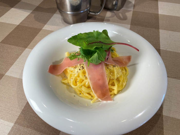 モチモチプリプリ食感の生パスタ。しっかり味のカルボナーラソースと生パスタの相性は抜群です。