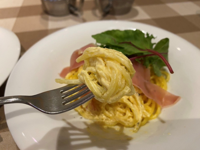 カルボナーラのコクとシャキシャキのベビーリーフ、生ハムの塩気が三位一体となっています。