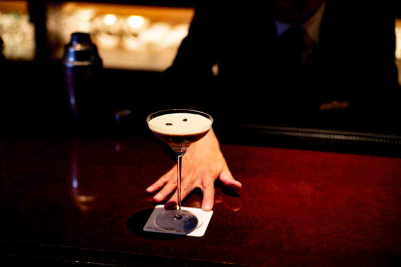 そのデザートに寄り添うように、バーデンダーさんがペアリングしてくれたのは、「シルキーノワール」。コーヒーリキュールとクリームを合わせたほろ苦く甘い一杯で、仕上げにコーヒー豆が添えられています。