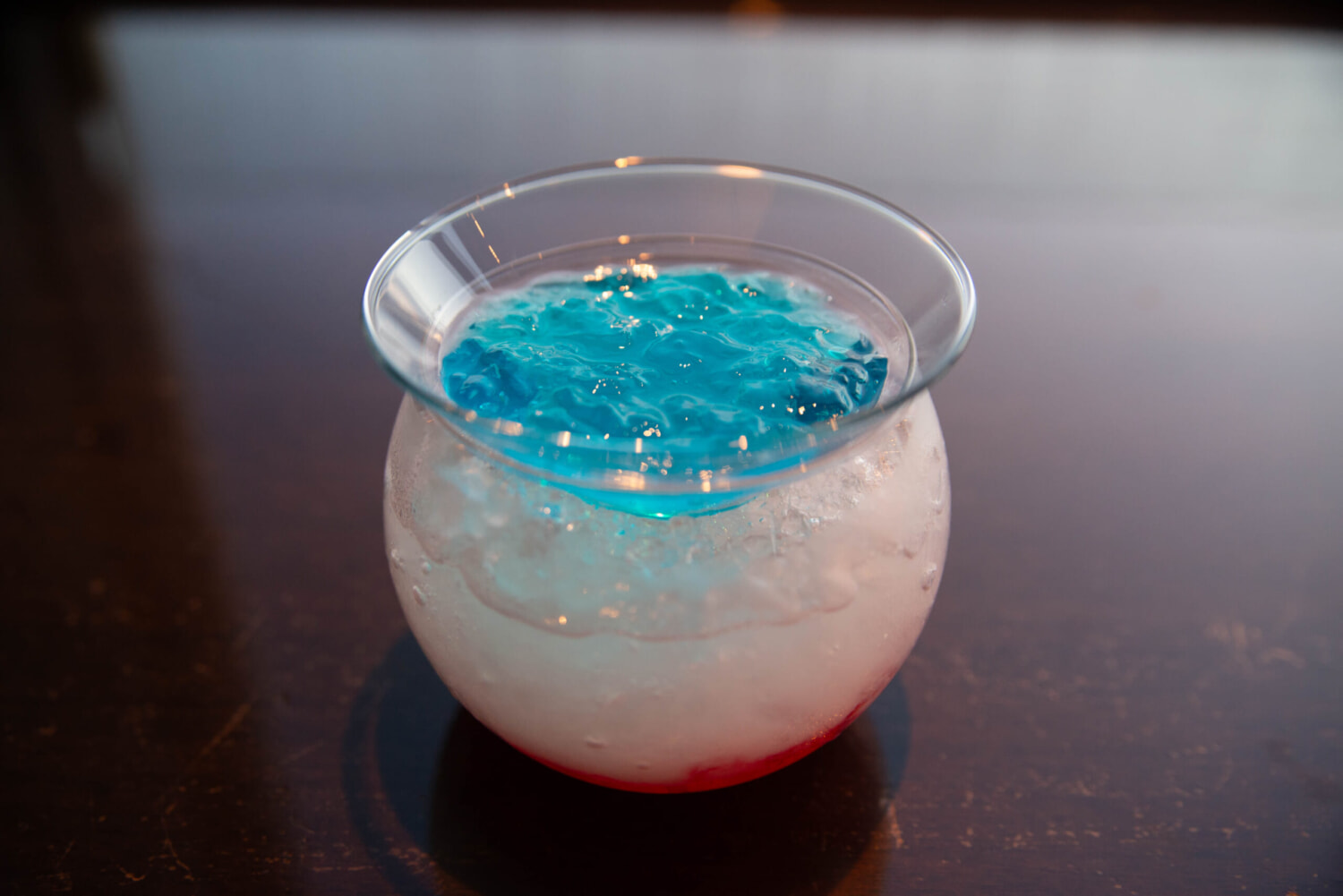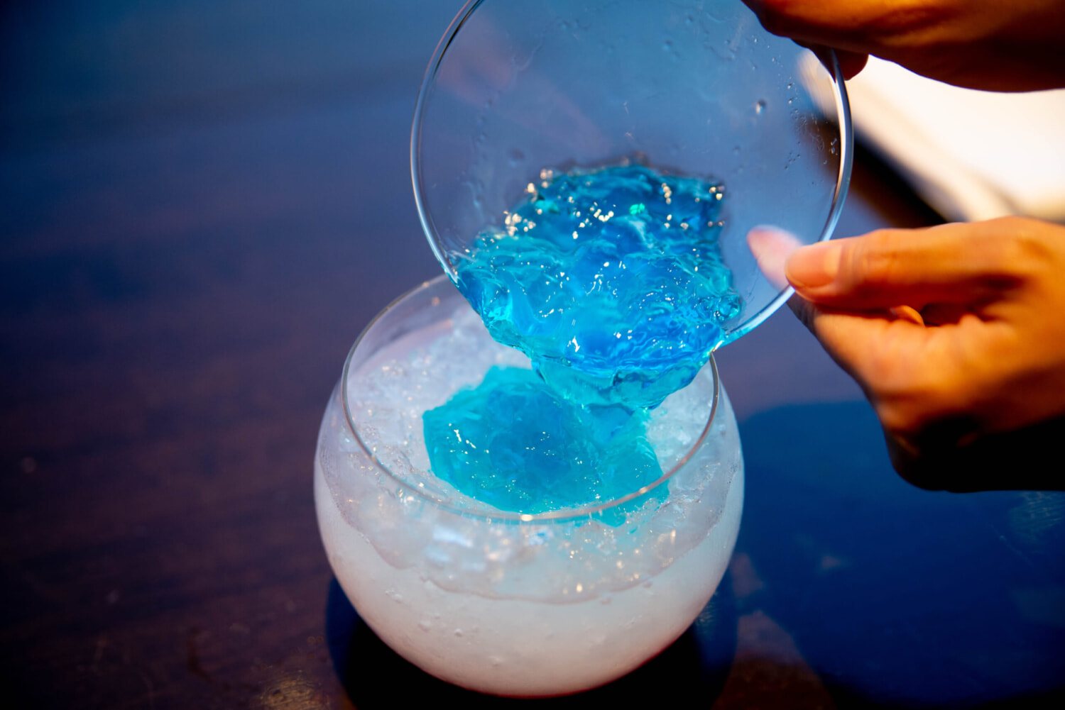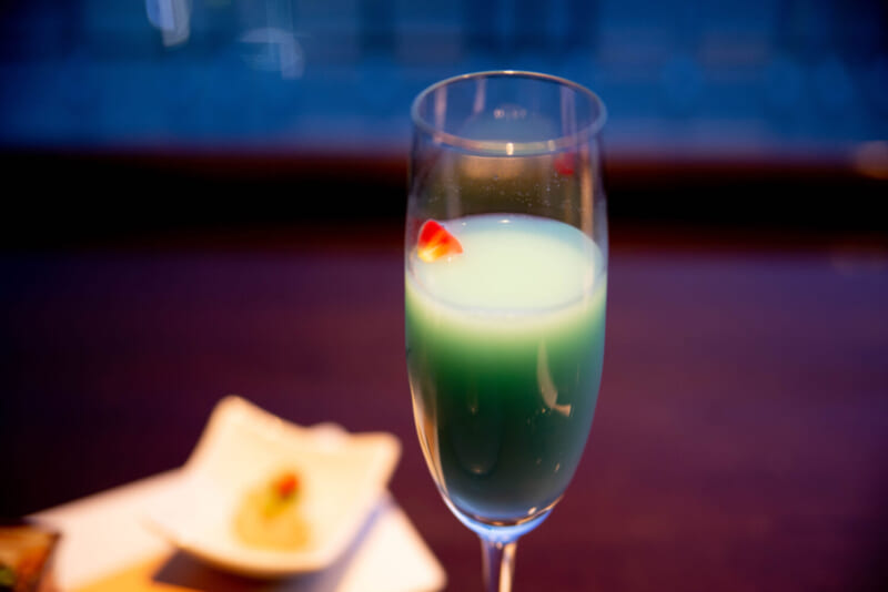 そこにペアリングとしていただいたのが、鮮やかなエメラルドグリーンのカクテル「オーシャンブルー」。