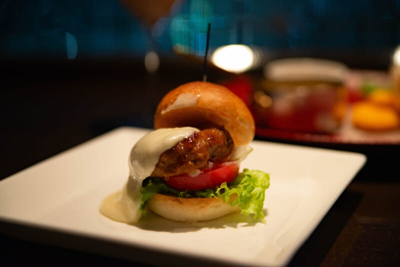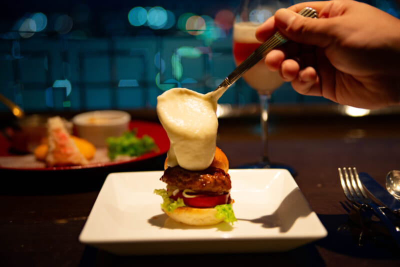 そしてさらにさらに、フレンチシェフが作る「山わさび風味バーガーwithチーズディップ」も登場。仕上げにスタッフさんが目の前で熱々のチーズをとろりとかける演出は、思わずスマホを構えて夢中でシャッターを切って盛り上がってしまいました(笑)。