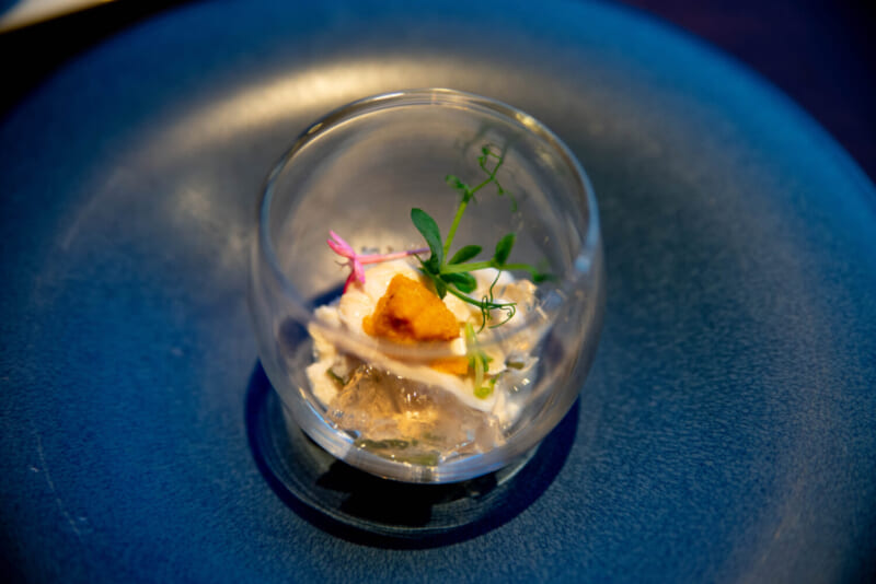 最初に登場したのは「お出迎えの逸品」。スタッフさんが「絹のクリームに、湯葉とウニのヴェリーヌ、順才入りの出汁ジュレを合わせています。下のジュレと一緒に召し上がってください」と説明してくれました。