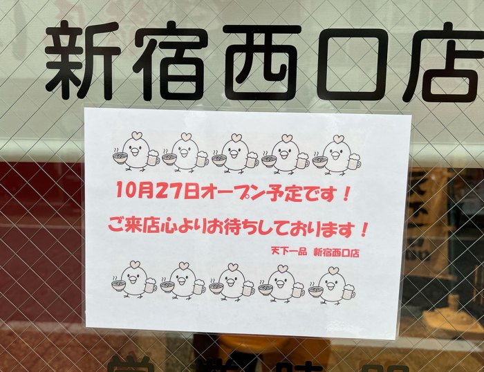 新宿近辺の天一ファンは楽しみに待たれよ。繰り返すが、新宿西口店のオープンは10月27日だ。