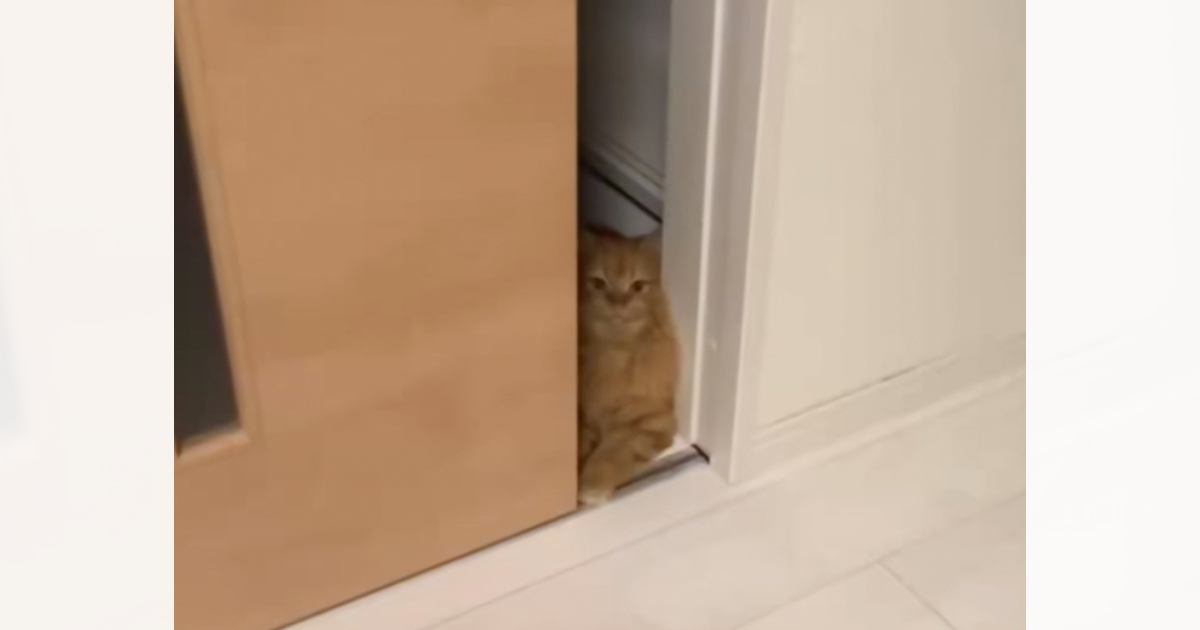 そんな可愛いちゃちゃまるちゃんですが、この日は様子が違ったそう。飼い主さんが何気なくちゃちゃまるちゃんの様子を伺うと、ドアと壁の間に挟まりながら、見たこともない表情で見つめてきていたといいます。