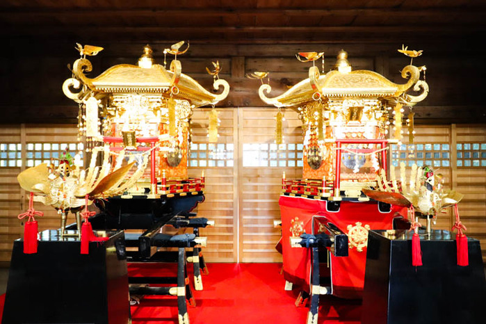 御朱印のデザインにもなっているお神輿は、旧拝殿内に展示されていて、見ることが可能です。