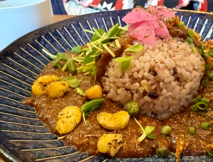 6種類のスパイスを使用した「淡路鶏薬膳キーマカリー」は、爽やかなハーブの風味にまず驚きます。優しい辛さを楽しみながら食べ進むうちに、体も心もほんのりポカポカに。