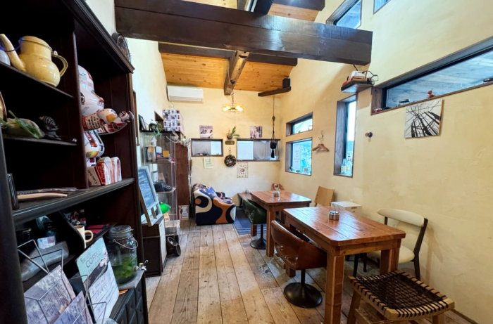 東浦平成病院のすぐ傍に立つ小粋な一軒家。こちらが『Café スパイス589』です。店内はこじんまりとしつつも、ゆったりとしたテーブル配置。ブラウンを基調にしたインテリアに、心がホッとほころびます。